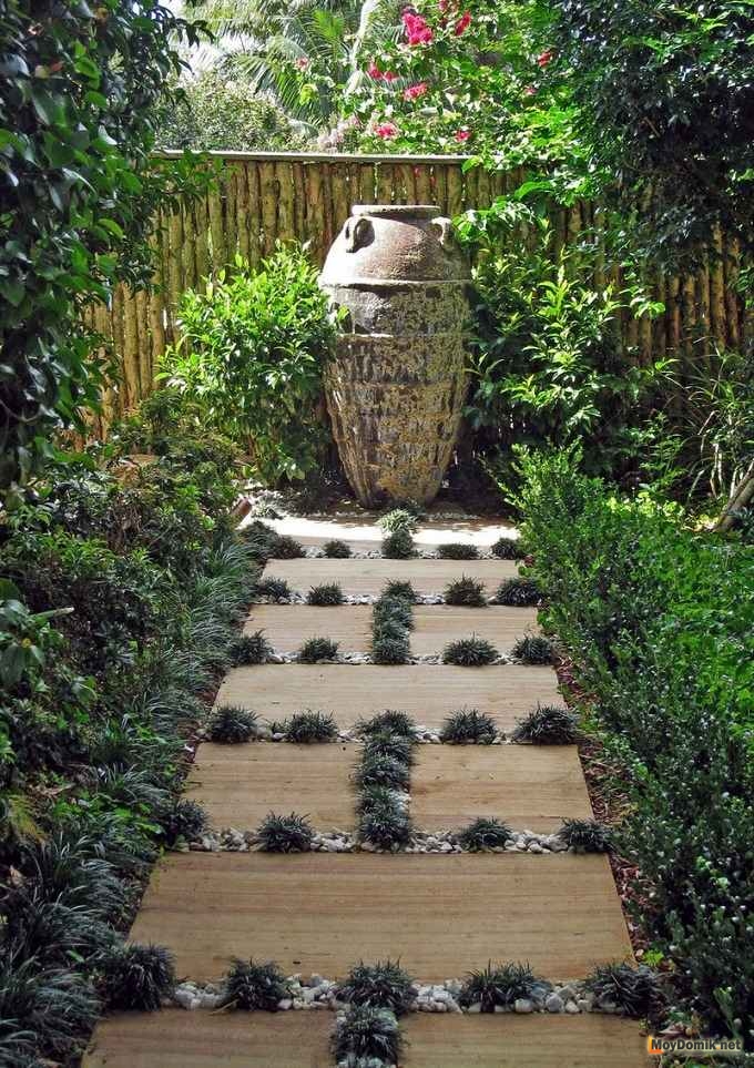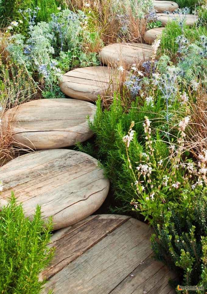 Как видно из фото, даже простая деревянная садовая дорожка имеет столько разновидностей, что глаза разбегаются.