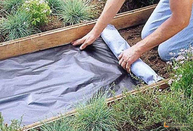 На дно траншеи укладывается гидзоизолирующая пленка (можно применить полиэтиленовую пленку, используемую для теплиц или геоткань).