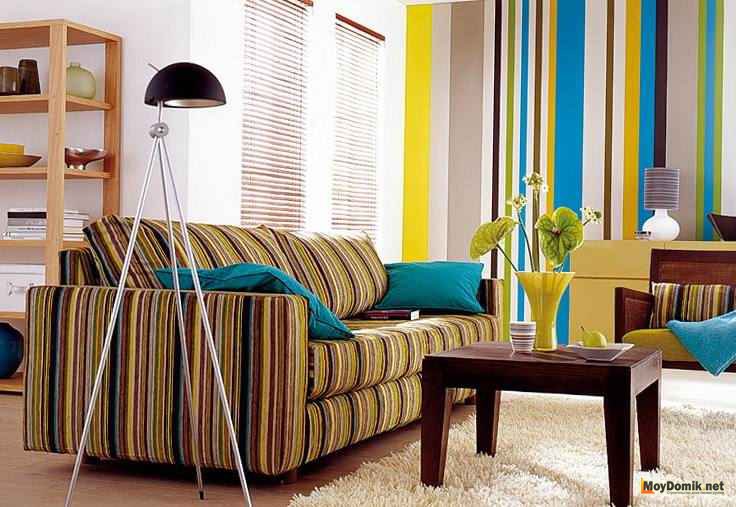 Полосы разной ширины и разного оттенка помогут добиться абсолютно разных визуальных эффектов. Так, чередование монохромных (близких по цвету обоев) поможет создать красивую игру света-тени на поверхности стен. А использование в отделке обоев контрастных цветов, поможет «раздвинуть» стены и внести в комнату дополнительную свежесть. При этом место стыковки листов не обязательно должно быть традиционным, оригинальным решением может стать зигзаг, волна, зубцы и др.