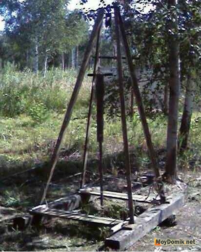 Выше упоминалось, что скважину можно забивать или бурить, какой из методов лучше, трудно сказать, все зависит от грунта, места и возможностей. Если специализированного оборудования для бурения скважины нет, а нанимать бригаду не хочется, то можно самостоятельно построить бурильную вышку – забивной станок.