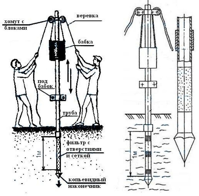 На отцентрованный ствол (трубу) одеваем бабку, принцип забивания прост – натягиваем веревку, конец которой привязан к бабке, резко отпускаем, ударная сила забивает ствол бабкой в землю.