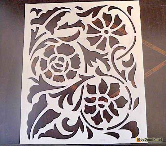 - вырезается нанесенный по шаблону узор. При этом, отверстия можно высверливать сверлами разного диаметра, а прорези выполнять лобзиком. Место ввода лобзика обозначается высверленным отверстием. Так рез будет более красивым;