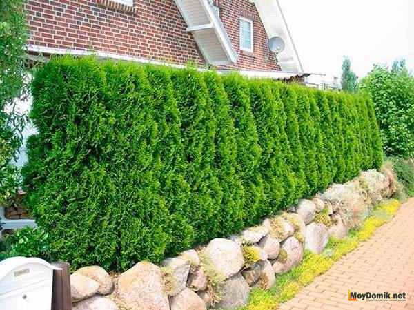 Жизненное дерево служит преградой от проникновения на территорию, прекрасно защищает сад от выхлопных газов, постороннего шума и пыли с улицы, задерживает снег и маскирует неэстетичные постройки за пределами участка.