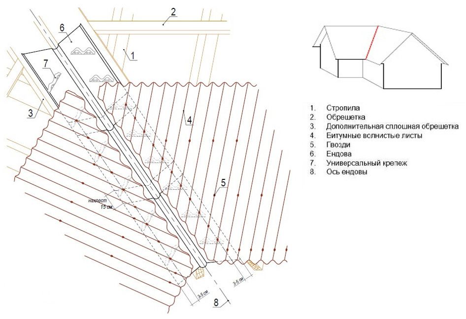 Монтаж ондулина на этом не завершается. Чтобы ваш загородный дом имел презентабельный вид, а крыша была надежно защищена от протекания, нужно установить декоративные элементы. К ним относятся конек, карниз, ветровая планка и ендова.