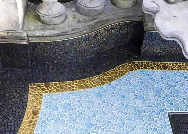 шероховатую плитку с мозаикой из гальки, ракушек или песка;
