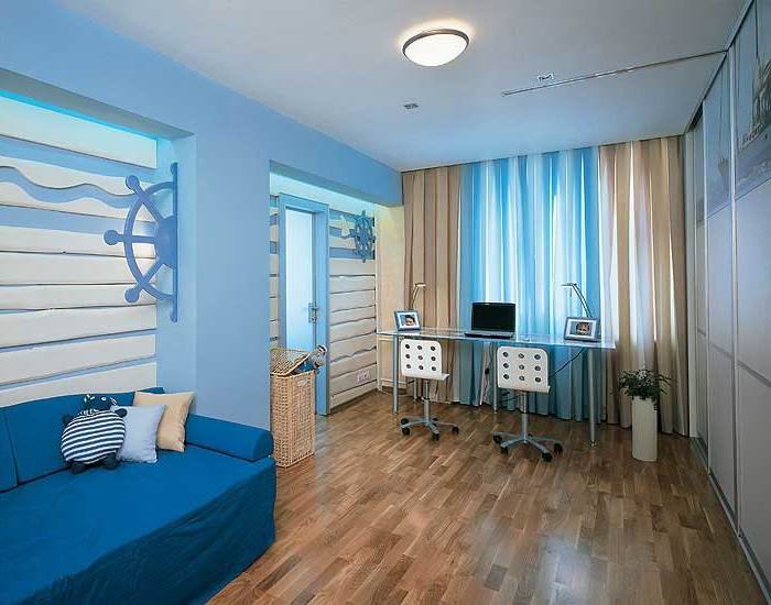 Но! Если хочется более тонких ассоциаций (к примеру, отдыха на белоснежной яхте), то ничто не мешает обставить квадратные метры мебелью из панелей МДФ или белого пластика. Достаточно немассивного мягкого уголка, диванчика и пары удобных кресел. Плетенной корзины, компактного стола из закаленного толстого стекла, комода, чем-то напоминающего пиратский сундук, и шкафчика в заданной тематике. И вуаля! Морской образ комнаты практически завершен.