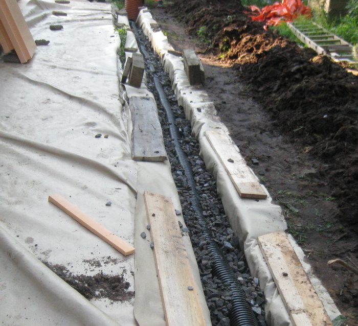 В случае, если планируется устройство ливневой системы, на конец пленки, противоположный от стены здания укладывается труба, которая засыпается щебнем. Он защищает трубу от забивания. Также устанавливается ливнеприемник и укладываются трубы ливневки.