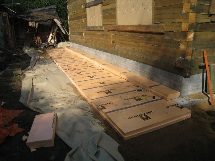 - установка пенополистирола (или пеноплекса) на поверхность фундамента (цоколя дома), он будет выполнять функцию утеплителя и компенсационного зазора между фундаментом и бетоным основанием;
