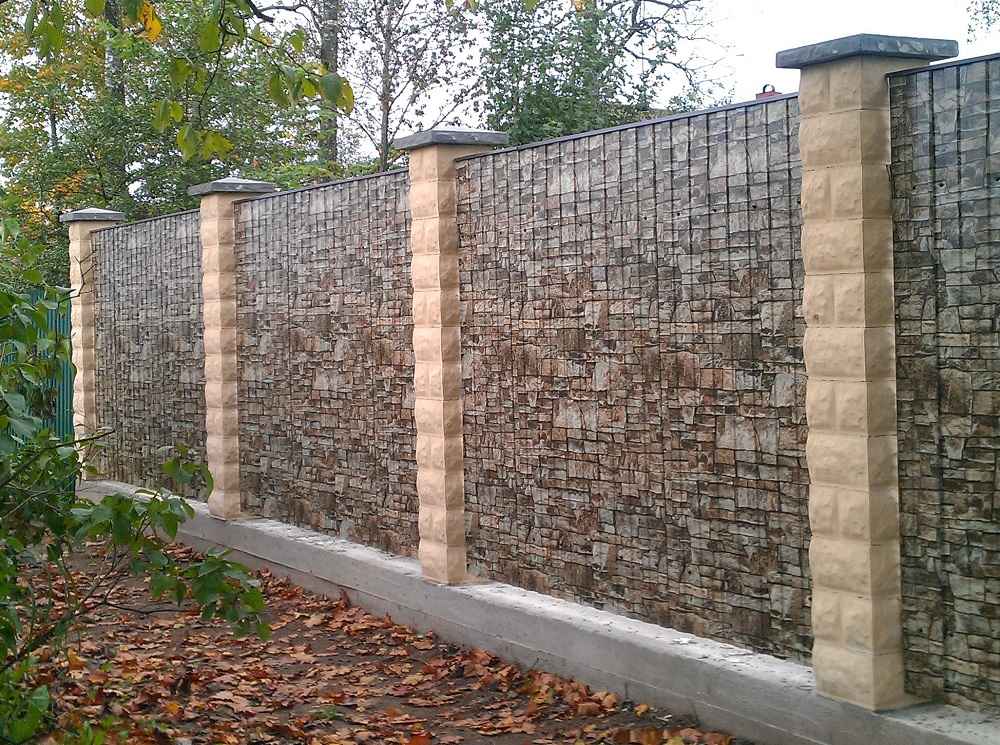 Сегодня популярным решением является использование профнастила с покрытием принтеч с рисунками под дерево, кирпич, камень и т.п. Профнастил Printech с имитацией очень выигрышно смотрится в готовом изделии. А декор, в виде колон, столбиков или кованных деталей, только придает забору солидности и престижности.