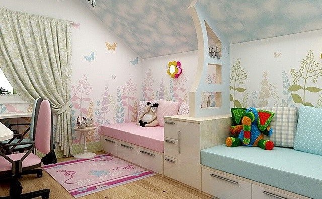 Классика жанра – украшать детскую дошкольников изображениями любимых героев и игрушек: машинки, роботы, феи или пони. А вот современным школьникам в спальной зоне скорее понравятся элементы обстановки ярких цветов и необычных конструкций на фоне нейтральной цветовой гаммы (например, светло-серой).