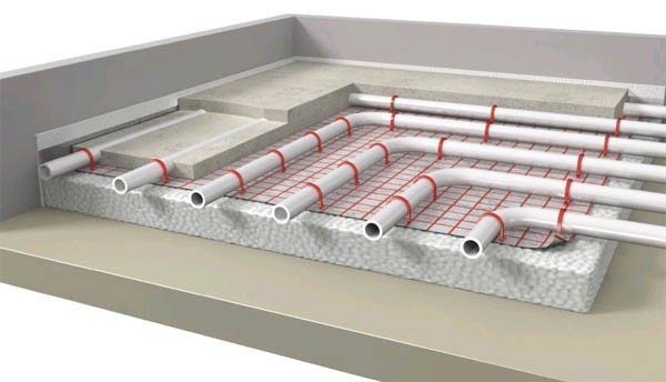 - Бетонная система. Предполагает заливку труб бетоном (обустройство стяжки);