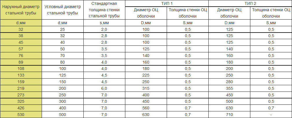 Размерный ряд. Наружный диаметр от 32 мм до 530 мм, внутренний 25-500 мм, толщина стенки 2-7 мм, диаметр оболочки ОЦ для 1-2 типа ППУ 100-710 мм, толщина оцинкованной оболочки 0,5-0,7 мм.