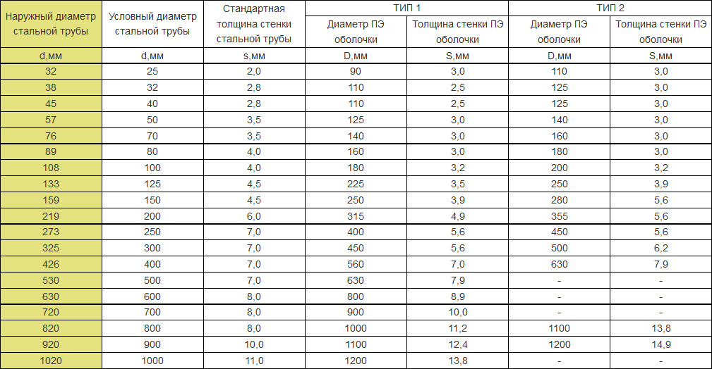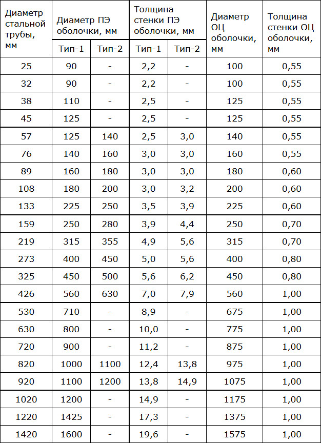 Размерный ряд. Наружный диаметр от 32 мм до 1020 мм, внутренний 25-1000 мм, толщина стенки 2-11 мм, диаметр оболочки ПЭ для 1-2 типа ППУ 90-1200 мм, толщина полиэтиленовой оболочки 3,0-14,9 мм.