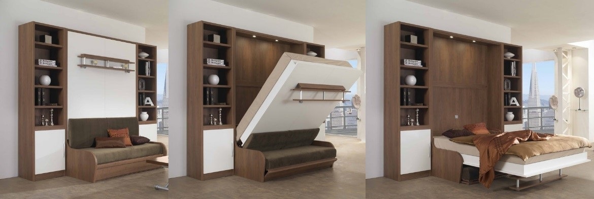 В дизайне однокомнатной квартиры студии важно найти компромисс между «прожиточным минимумом» бытового помещения и «воздушностью», простором. Для этого в квартире с открытой планировкой выбирают предметы, которые выполняли бы не одну функцию, а несколько. Например, многофункциональная тумбочка-трансформер, которая превращается в стол и два стула, или странный, но гениальный стол, который в сложенном виде крепится на стену как картина.