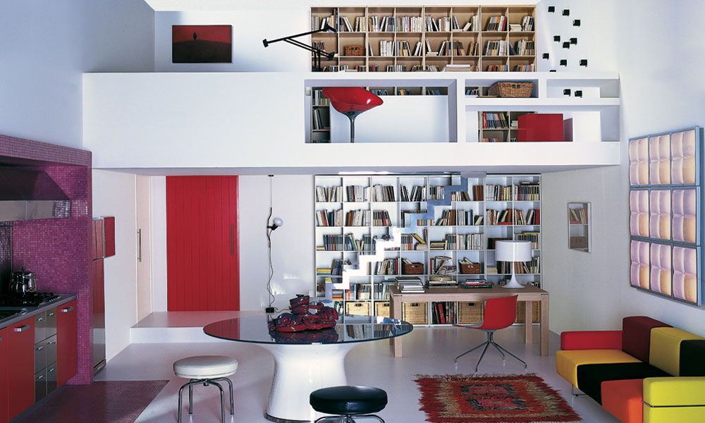 В дизайне этой квартиры студии стиля Поп-арт внимание привлекает пестрый текстиль и красный журнальный столик в стиле 60-х.