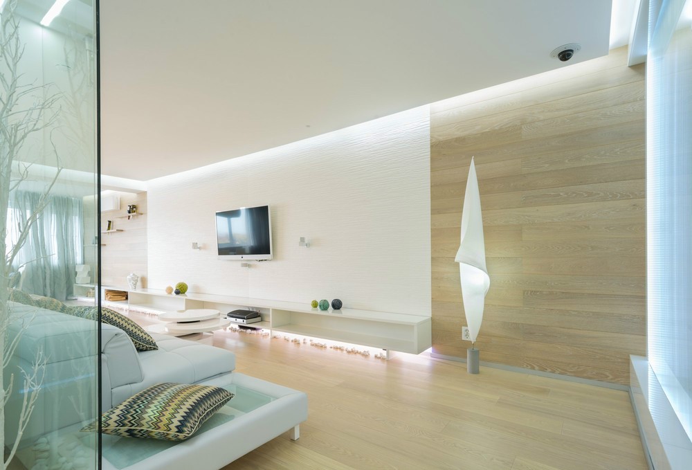 - Зону гостиной в квартирах открытого плана помогут выделить подиумы. А вот потолок в небольших студиях «ступенчатым» делать не рекомендуется. Этот прием визуально уменьшит помещение.