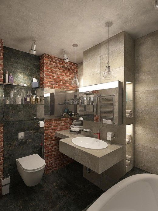 А вот ванная комната и туалет в дизайне квартиры-студии Loft сделаны хорошо, не наплевательски. Есть грубые стены и возле них дорогая дизайнерская сантехника. Пять с плюсом.