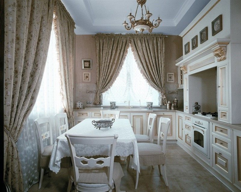 Дизайн кухни с большими окнами на разных стенах для типичной современной семьи, может быть выполнен в духе романтичного классицизма. Примечательная деталь такого интерьера: тяжелые портьеры, которые редко встретишь на кухнях 2017 года.