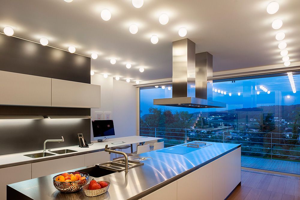 - Чтобы света на кухне было достаточно, в потолок монтируют встроенные светильники.