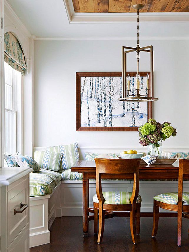 Места хранения под окном замаскированы под уютные дополнительные места для сидения. Над окном кухни хлопковая рулонная штора, перекликающаяся по цвету с обивкой стульев, матрасов и подушек.