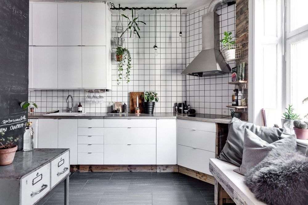 Выбор белого цвета на кухню с большим окном, где света более чем достаточно неслучаен. Он скрывает противоречия в интерьере, объединяет все его части в единое целое. Более того, в скандинавском стиле на окнах практически всегда отсутствуют шторы. Исключение – хлопковая светлая ткань или полупрозрачный тюль.