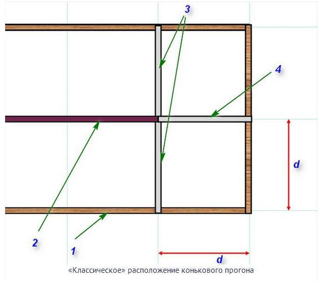 Прогон – это балка, устанавливаемая параллельно сторонам мауэрлата. Прогон служит основанием для монтажа дополнительных опор под стропильными ногами. Устройство прогона не является обязательным этапом работ и выполняется только для вальмовых крыш большой площади или имеющих конфигурацию повышенной сложности. Место размещения прогона, показано на схеме.