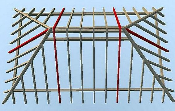 - увеличение прочности диагонального стропила вальмовой крыши за счет удвоенного сечения;