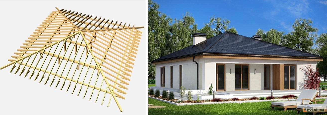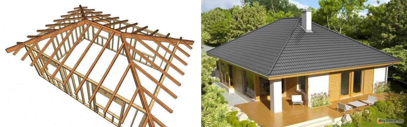 Отличается отсутствием опорной балки конька. Это приводит к тому, что все диагональные ребра сходятся в единой точке, а к ним уже примыкают рядовые короткие стропила. Такой крыше отдают предпочтение при наличии квадратной коробки дома. Но формирование надежного конькового узла достаточно сложное.