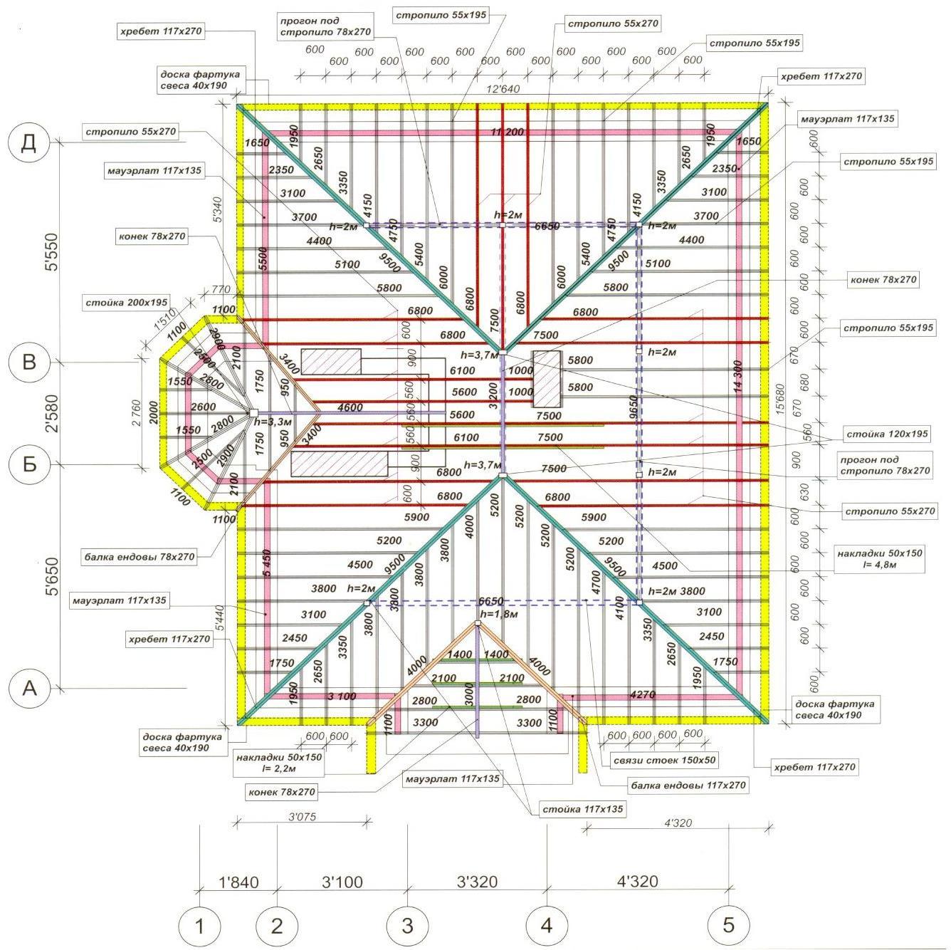 Итогом разработки проекта и расчетов будет схема-чертеж стропильной системы вальмовой крыши. Не бывает похожих чертежей, готовых к применению без учета особенностей конкретного строения и места его постройки.