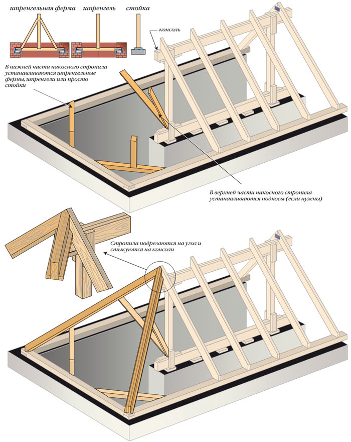Варианты верхнего крепления диагональных стропил показаны на схеме.