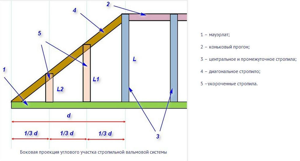 Расчет стропильной системы вальмовой крыши выполняется с учетом таких предпосылок: