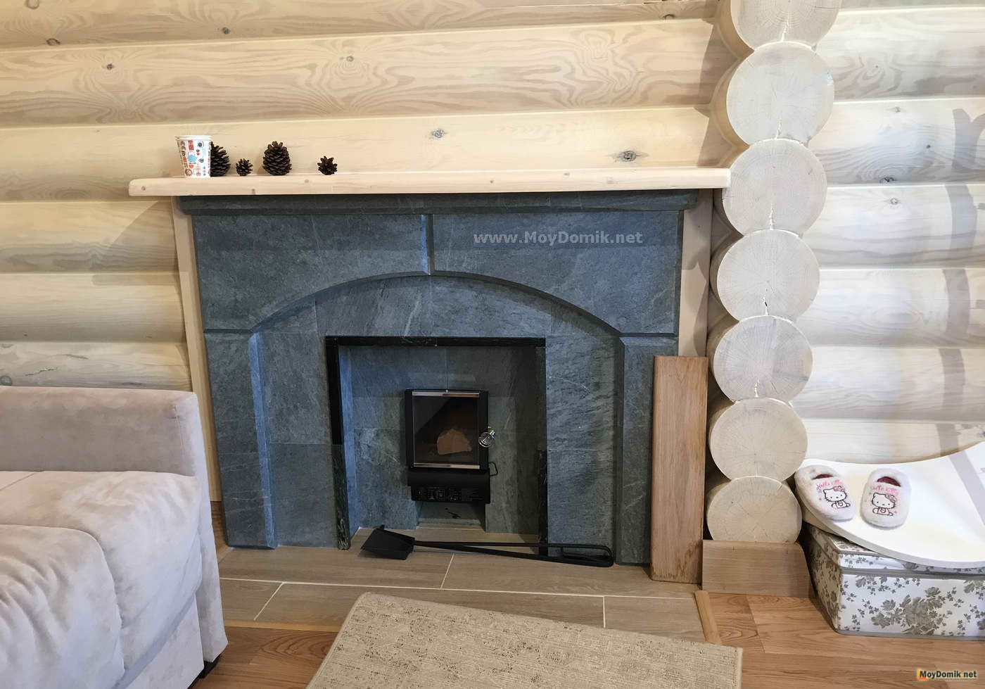 Интерьер бревенчатого дома с печкой или камином