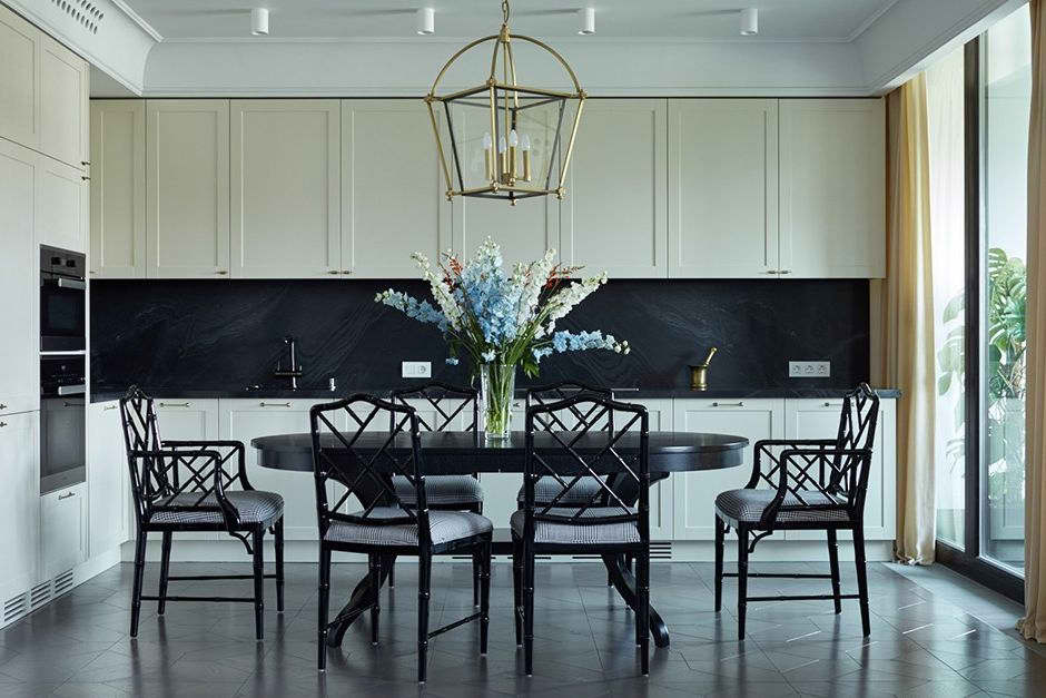На фото современная кухня в доме из бревна с выходом на террасу. Строгие темные акценты стали контрастом к спокойной цветовой гамме.