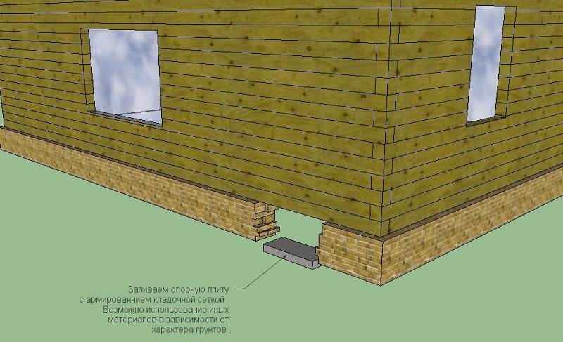 - установка бетонных или кирпичных опор по углам дома. Возможен также монтаж свай. Они позволят снизить нагрузку на фундамент в дальнейшем. Высота опоры равна высоте нового фундамента;
