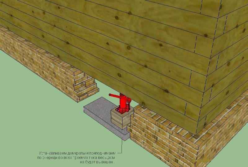 Вывешивание дома с помощью домкратов. Приподнимать нужно попеременно во всех проемах.