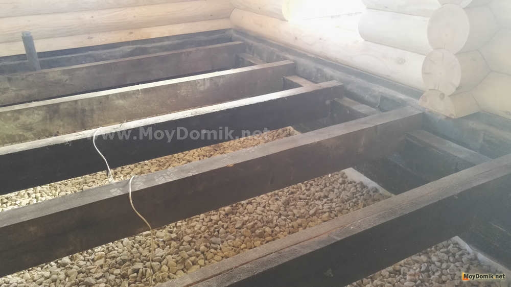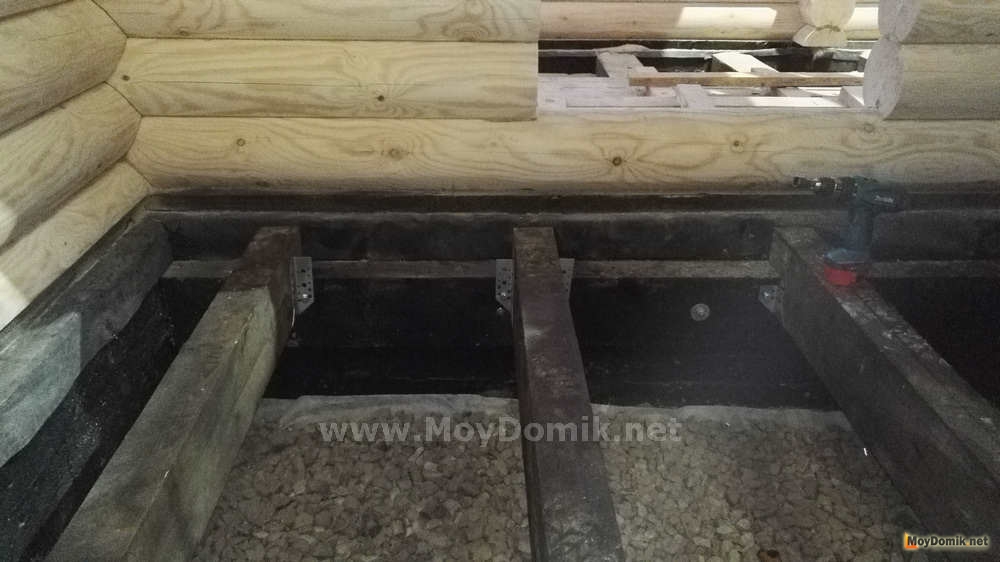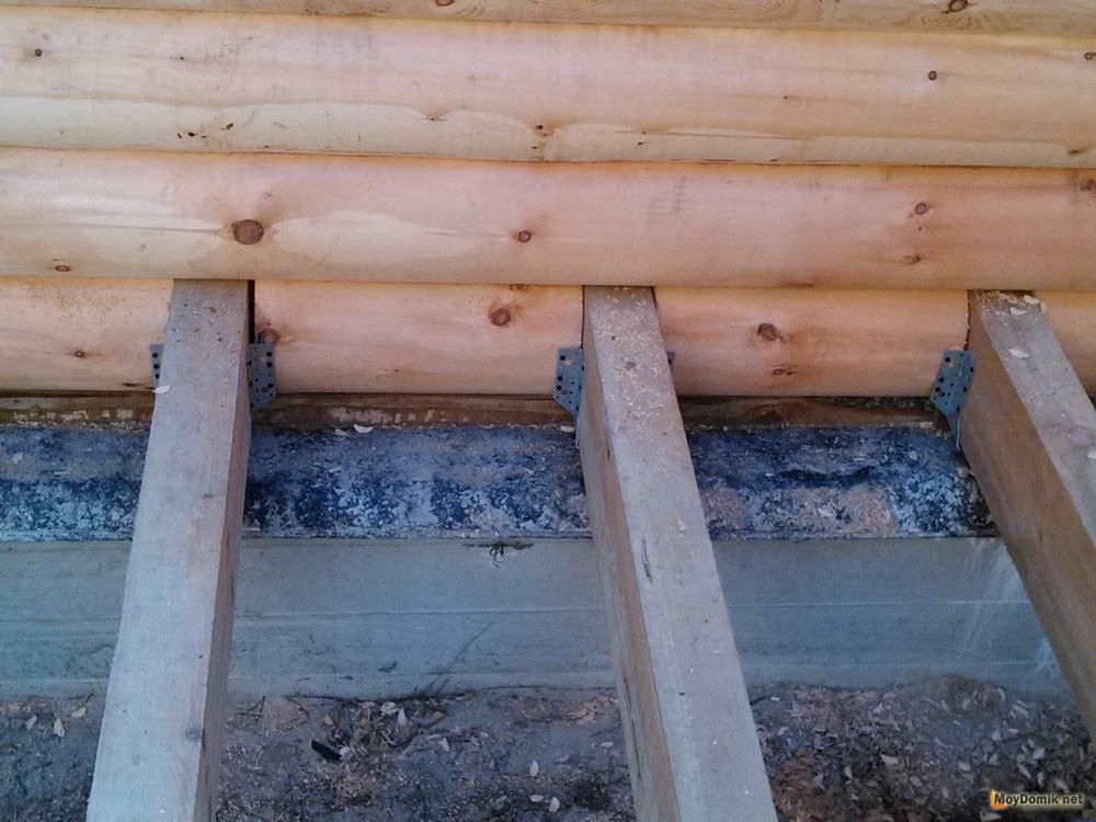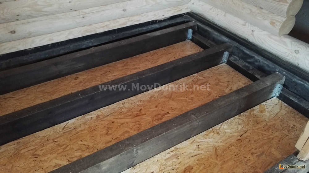 Лаги для пола опираются на брус, прикрепленную к фундаменту