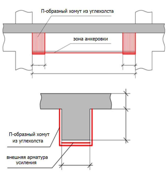 Ниже приведена схема армирования (усиления) балок перекрытия углеволокном.