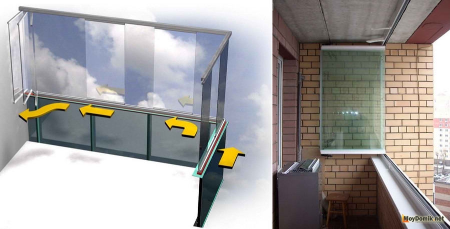 В первом случае, створки не требуют места для открывания, во втором – нуждаются в наличии так называемой парковочной зоны, где будут собираться створки в момент открывания. Безрамное остекление позволяет реализовать панорамное остекление балкона – вариант, при котором, улучшается обзор.